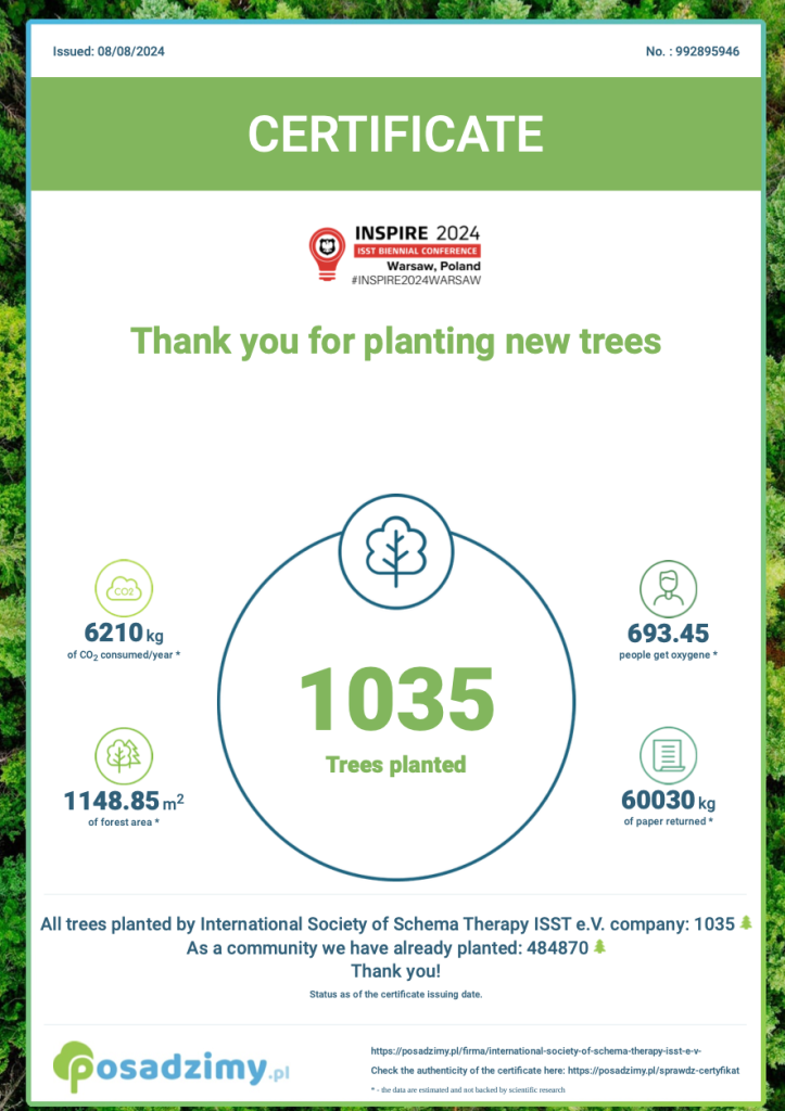 انجمن بین المللی طرحواره درمانی(ISST)، در کنفرانس ۲۰۲۴ورشو لهستان، در راستای مسئولیت محیط زیستی خود، ۱۰۳۵ درخت کاشته است.